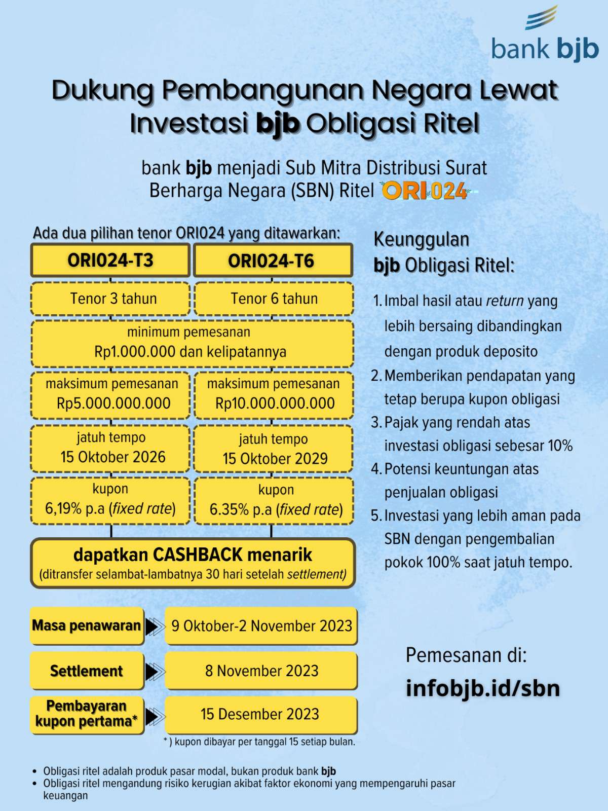 Masa penawaran ORI024 berlangsung dari 9 Oktober hingga 2 November 2023. Perhitungan bunga berjalan (settlement date) terhitung mulai tgl 8 November 2023.