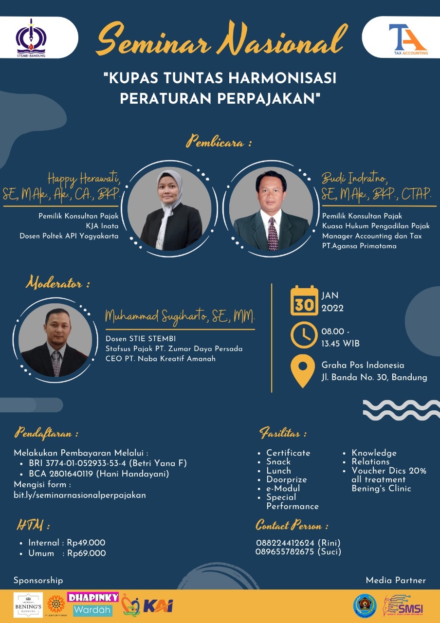 JURNAL MEDIA, BANDUNG — Mahasiswa Sekolah Tinggi Ilmu Ekonomi Stembi atau STIE STEMBI Bandung, dalam waktu dekat bakal menggelar Seminar Nasional tentang Perpajakan dengan mengambil thema “Kupas Tuntas Harmonisasi Peraturan Perpajakan”.