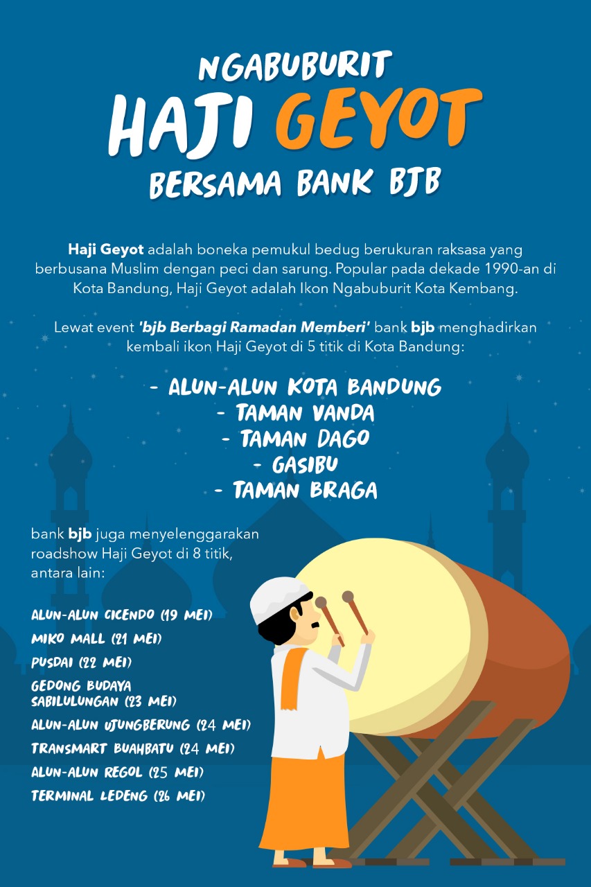Selain Haji Geyot, event ‘bjb Berbagi Ramadan Memberi’ ini juga diisi dengan berbagai kegiatan lainnya, di antaranya buka bersama dan santunan yatim dhuafa di sejumlah daerah di tanah air, pesantren kilat dan kampung Ramadan bank bjb. Berbagai kemeriahan yang tersaji selama Ramadan ini merupakan bentuk tandamata untuk negeri sekaligus menjadi penanda rangkaian kemeriahan Hari Ulang tahun bank bjb ke-58. Red