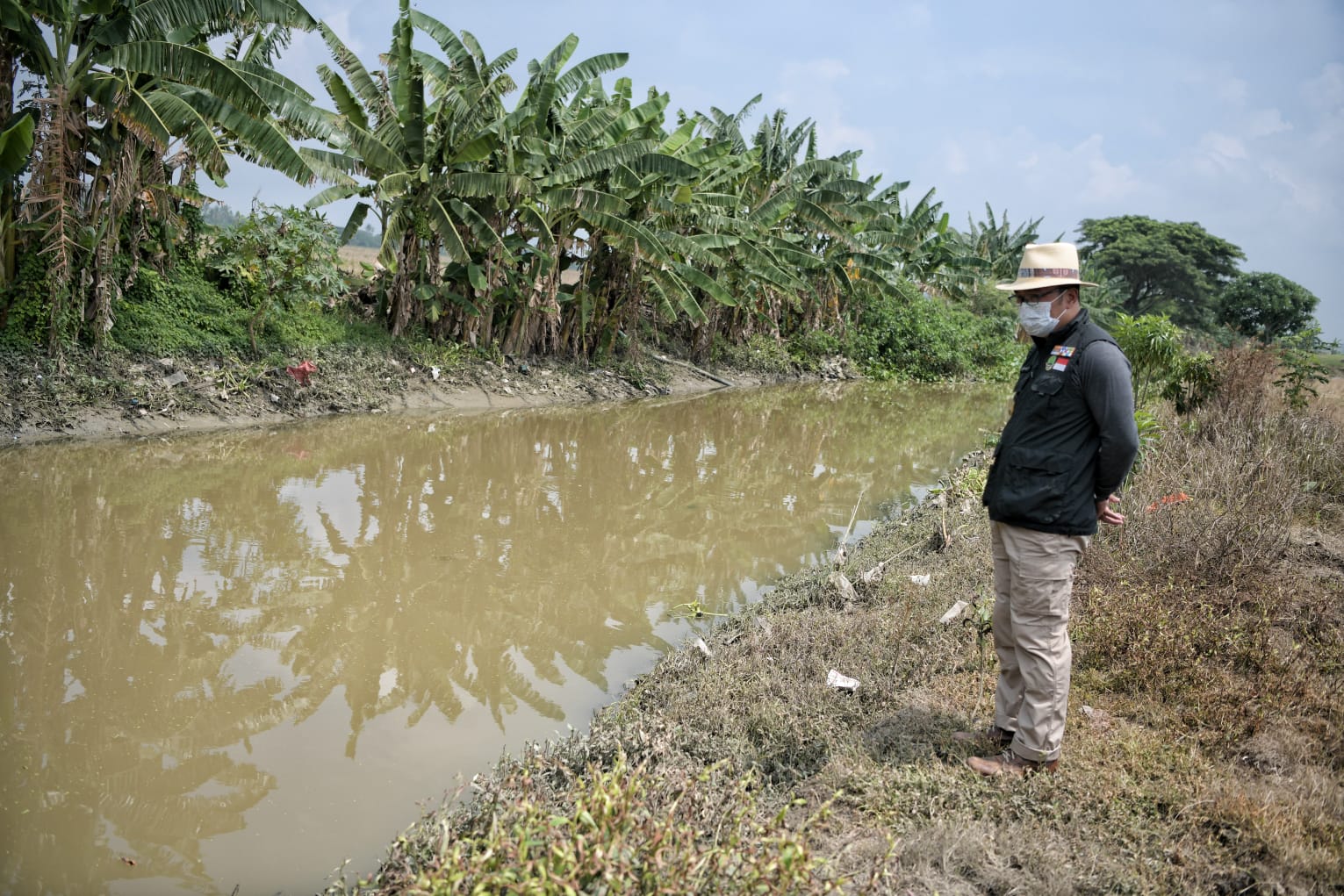 JURNAL MEDIA, BEKASI — Usai karantina tiga hari sepulang lawatan luar negeri, Gubernur Jawa Barat Ridwan Kamil langsung meninjau Kali Rasmi di Desa Wangunharja, Kecamatan Cikarang Utara, Kabupaten Bekasi.