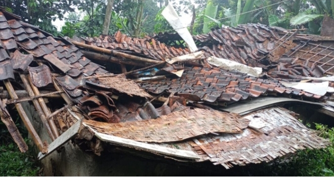 Rumah semi permanen milik Jajan (77) ambruk total pada bagian atap akibat tiang penyangga yang sudah lapuk. Beruntung, saat kejadian pemilik rumah yang tengah tertidur berhasil selamat setelah reruntuhan tersangga oleh beberapa perabotan rumah.