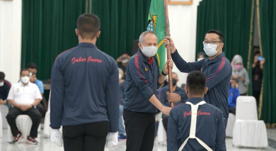 BANDUNG, Jurnalmedia.com — Jelang Pekan Olahraga Nasional (PON) XX Tahun 2021 Papua, Gubernur Jawa Barat Ridwan Kamil mengukuhkan dan melepas